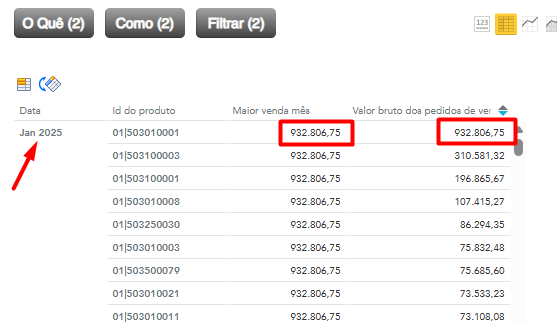 Na imagem abaixo, vemos que em janeiro a métrica capturou o produto com maior valor de venda: